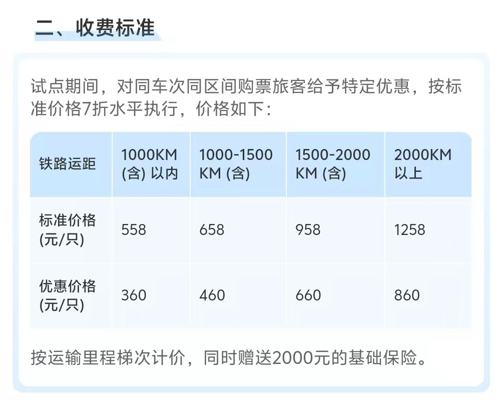 记者从国铁集团获悉,4月8日起,铁路部门在京沪高铁部分车次试点“隔离运输、人宠分开、专人看护”的高铁宠物托运服务,铁路12306同步推出“宠物托运”功能,旅客提前两天及以上线上预约,预约成功后可同车托运1只家庭驯养且健康状况良好、单只体重不超过15公斤、肩高不超过40厘米的猫、犬类宠物。试点高铁宠物托运服务按运输里程梯次计价,初期实行七折优惠,1000公里内360元/只起,同时赠送保额2000元的基础保险。
