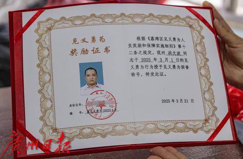 3月21日,这位勇救落水者的英雄被广州市荔湾区授予见义勇为荣誉称号。