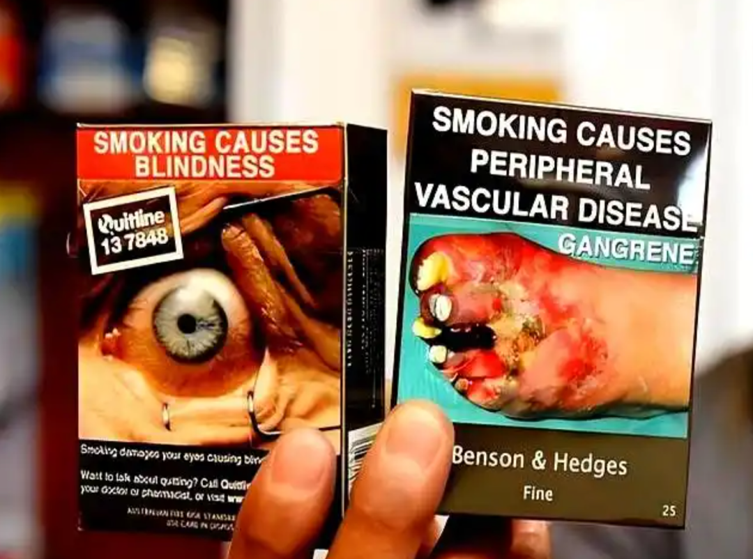 此外,澳洲还擅长利用视觉劝退法:在香烟包装上具象且生动地展示出吸烟有害健康的可怖后果,比如发黄腐烂的牙齿、暴突的人类眼球和肺癌示意图。