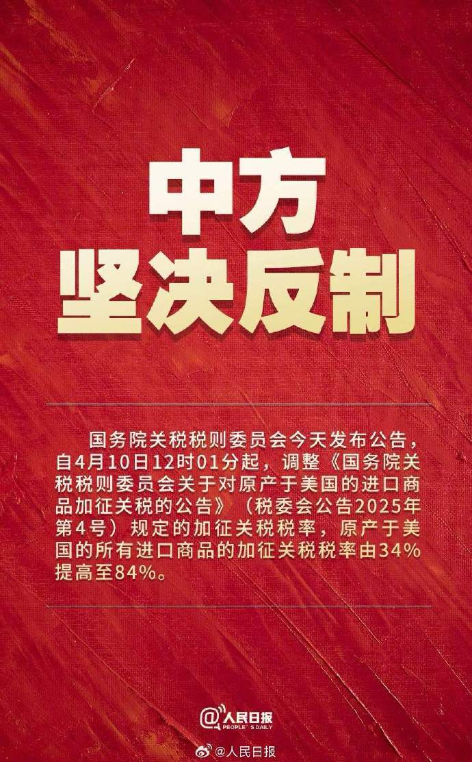 国务院关税税则委员会4月9日发布公告,根据《中华人民共和国关税法》、《中华人民共和国海关法》、《中华人民共和国对外贸易法》等法律法规和国际法基本原则,经国务院批准,国务院关税税则委员会公布公告,自2025年4月10日12时01分起,调整《国务院关税税则委员会关于对原产于美国的进口商品加征关税的公告》(税委会公告2025年第4号)规定的加征关税税率,由34%提高至84%。其他事项按照税委会公告2025年第4号文件执行。