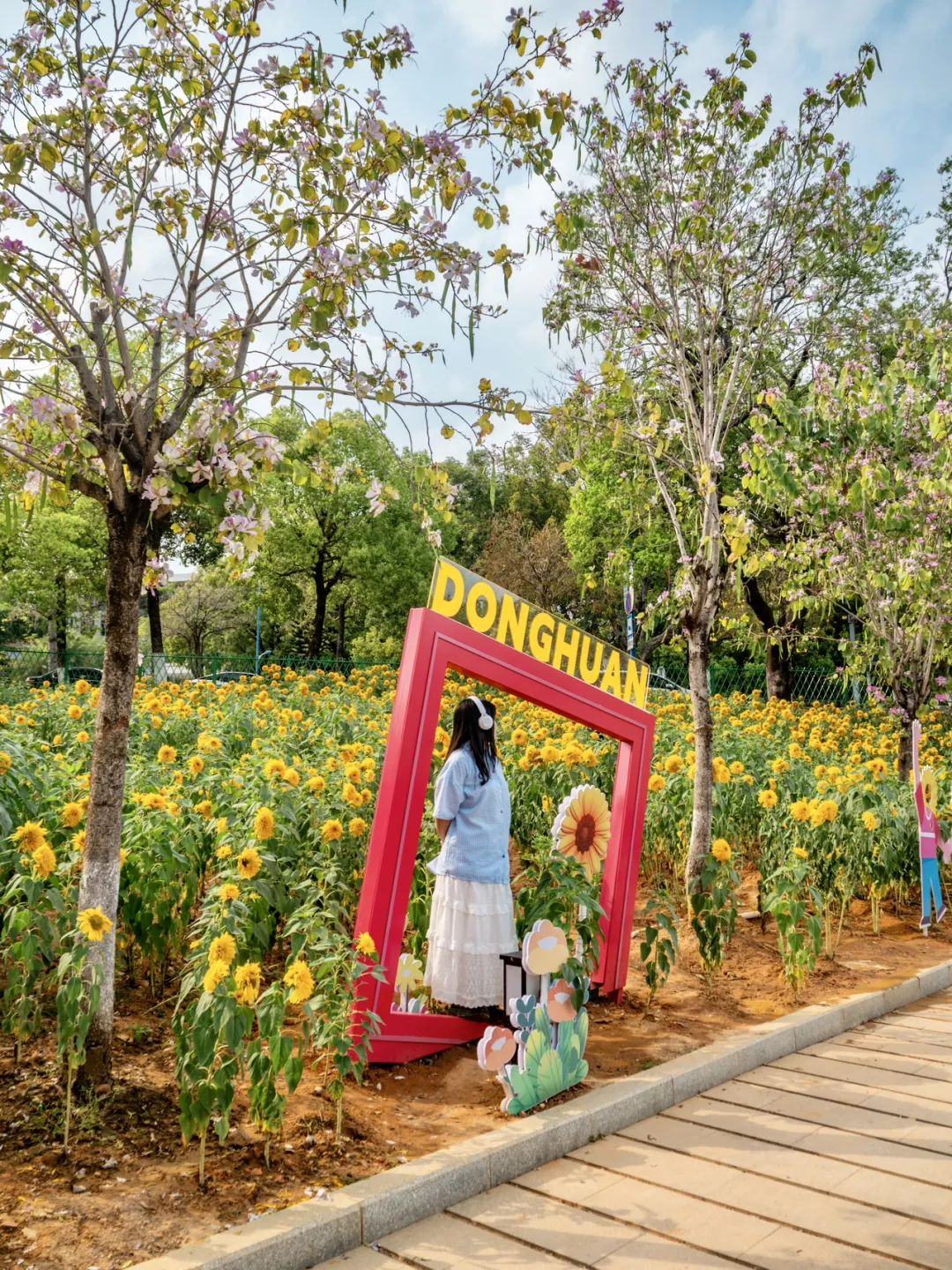 微风拂过时,千瓣葵花浪翻涌,花瓣边缘在阳光下泛出玫瑰金光泽,宛如梵高油画中的《向日葵》场景。暮色时分,花田随光影变幻流转,金黄渐变为焦糖色,更添浪漫氛围。