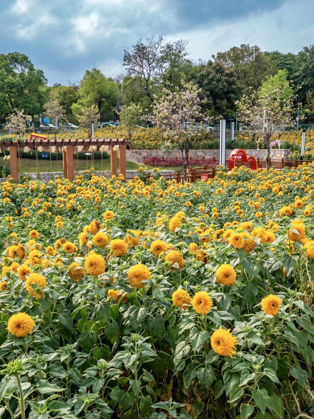 来到公园现场,只见上万株毛茸茸的千瓣葵在古樟树的映衬下绵延成金色海洋,古樟树的斑驳光影与金色花田,形成“古树逢春”的奇景。