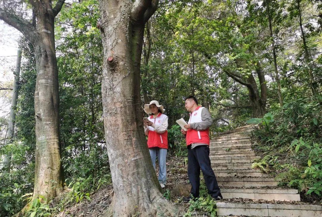日前,在佛冈水头镇西田村,巡查小组穿梭在葱郁的山林间。他们沿着蜿蜒曲折的山路,借助工具逐棵查看古树的枝叶、树干和根部的生长现状,并记录采集各项数据。