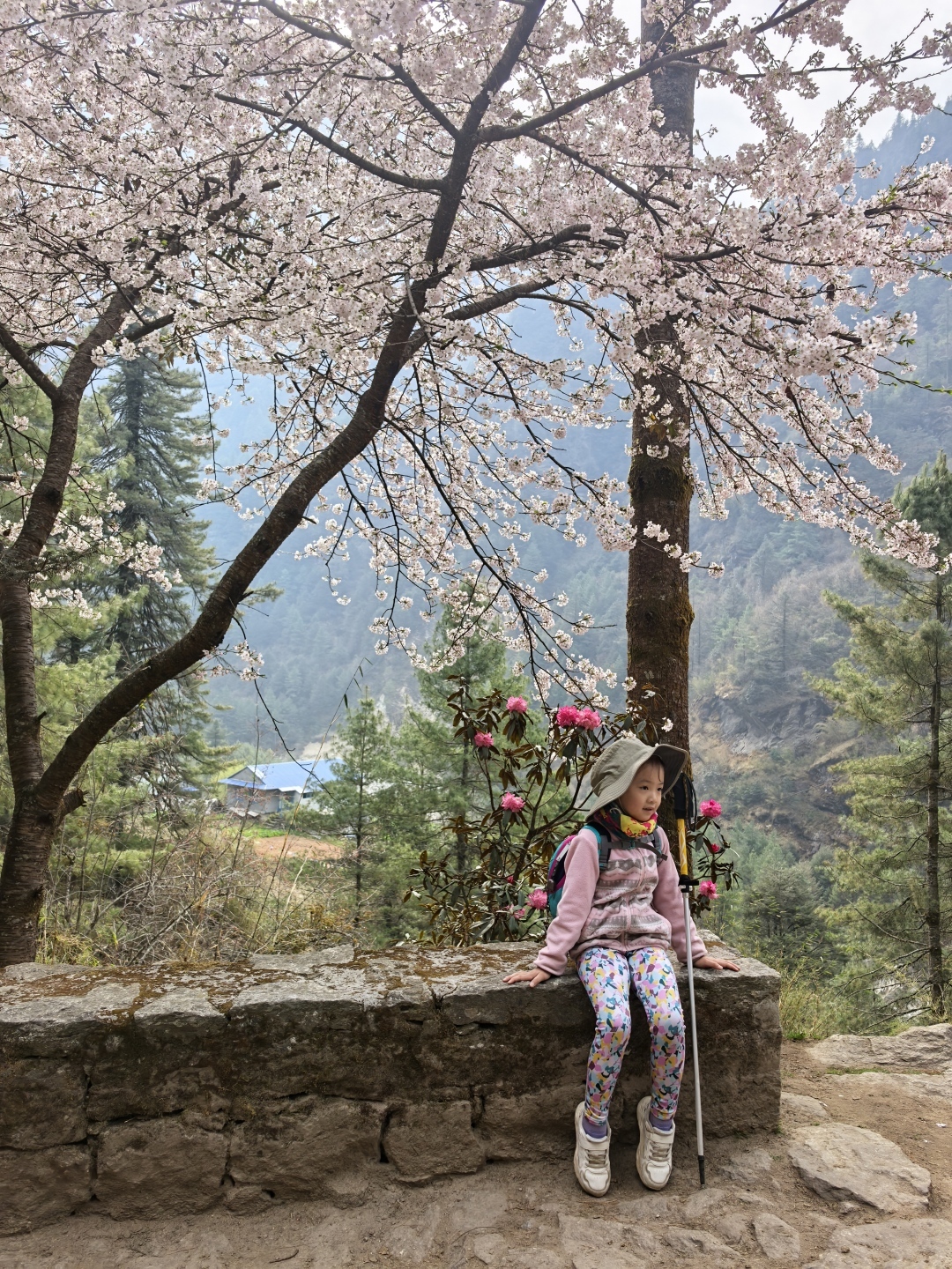 然而,开始徒步出发不久,珠珠就经历了第一次考验。第一天从卢卡拉到帕克丁,是一段海拔2800到2600的下坡路,因为不习惯崎岖的山路路面,出发不久珠珠就摔了一个跟斗。这小小的挫折并没有吓退珠珠,反而让她打醒精神享受徒步的乐趣。看到樱花、桃花、高山杜鹃,她会跟妈妈说:“看,这是徒步的礼物!”走过铁索桥,珠珠还调皮地左右晃动,发出咯咯咯的笑声;路上偶遇的小熊猫、牦牛、野狗给珠珠增添了不少乐趣,即使是7公里连续爬升716米的路程,珠珠也从未说累,沿途不少驴友都给她竖起大拇指:“珠珠真棒!”