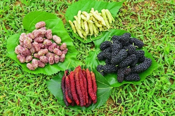 桑果又叫桑葚子,营养丰富,中医认为,常吃桑葚能提高人体免疫力,具有延缓衰老,美容养颜的功效,被赞誉为“民间圣果”,除了可以直接食用外,还能榨汁或酿酒。展示园内,“粤葚大10”种得最多,个头大,据说花青素含量是一般桑果的两倍,出汁率高,又因为无籽,所以口感也好;长果桑又细又长外形独特,甘甜无酸,稍红即甜;白果桑或浅绿或浅紫,有颜值有口感;香金葚则带着浓郁的奶香味,十分可口,让人吃了还想吃;垂桑、鸡爪桑虽也挂满了果,但却是作为盆景之用。