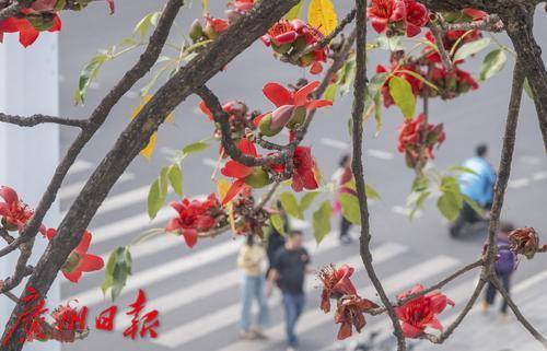 阳光闪现,路边盛开的木棉花。