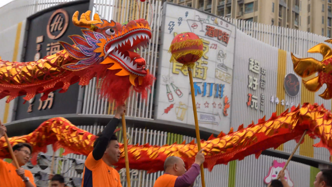 锣鼓喧天,由数百人组成的民俗大巡游尽显非遗文化魅力。伴随着激昂的鼓点和欢快的音乐,传统民俗舞龙、财神爷、腰鼓舞等巡游队伍身着华丽服饰惊艳亮相,营造浓厚的国潮氛围。