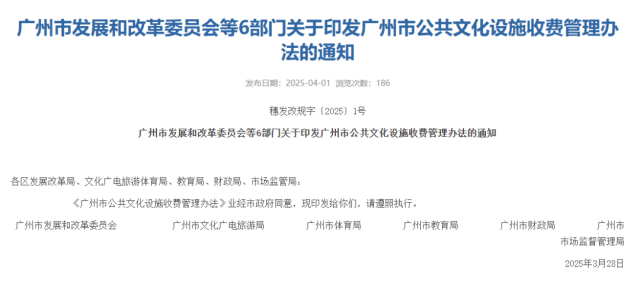 近日,广州市发展和改革委员会等6部门印发了《广州市公共文化设施收费管理办法》(以下简称《管理办法》),进一步规范公共文化设施收费行为。《管理办法》指出,有条件的公共体育场馆应当免费或低收费开放,并严格落实全民健身基本公共服务标准和公共体育场馆基本服务规范的有关要求。