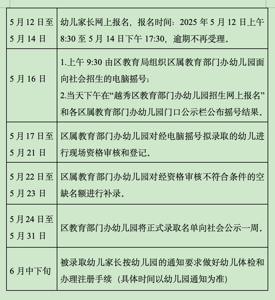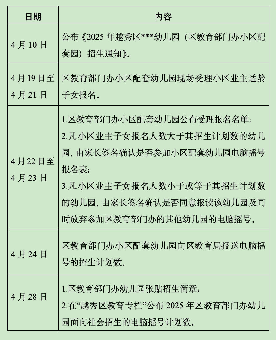 4月9日,广州市越秀区教育局发布《关于做好2025年幼儿园招生工作的通知》(下称《通知》)。《通知》显示,区教育部门办小区配套幼儿园面向小区业主子女招生报名时间为4月19日至4月21日、面向社会招生网上报名时间为5月12日至5月14日。