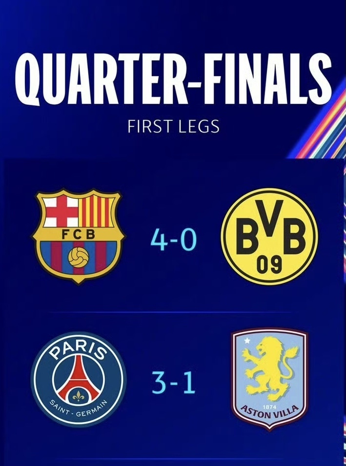北京时间今晨,2024—2025赛季欧冠1/4决赛首回合再战两场,巴萨和巴黎圣日耳曼均在主场获胜,特别是4球完胜对手的巴萨可以说已基本锁定了四强席位。1/4决赛次回合将在下周进行,届时本赛季欧冠4强将全部揭晓。