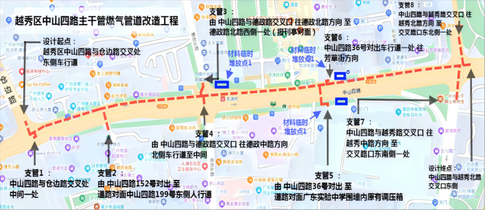 根据《国务院办公厅关于印发城市燃气管道等老化更新改造实施方案(2022—2025年)的通知》《广州市城市管理和综合执法局关于进一步做好燃气管道设施老化评估和更新改造相关工作的通知》等文件要求,广州燃气集团有限公司西区分公司将开展越秀区中山四路燃气管道改造工程,对该路段老化管网进行技术改造,消除管道腐蚀泄漏隐患,切实有效维护人民群众生命财产安全和城市安全运行。