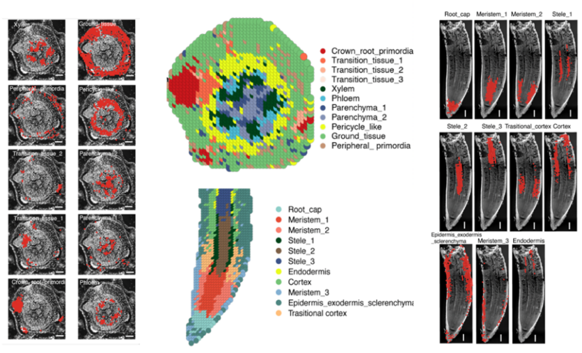 针对这一表型差异,团队通过Stereo-seq时空组学技术,成功构建了陆稻根系发育的动态基因表达图谱,重建了冠根原基的生长过程,揭示了陆稻胚芽鞘节的细胞类型及其分布。