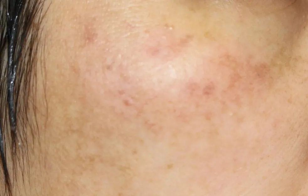 患者脸上呈现红血丝、轻度红肿以及胡椒面样色素沉着,均属于炎症后反应。