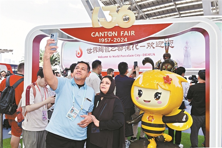 第136届广交会上,外国客商与吉祥物合影留念。(资料图片)