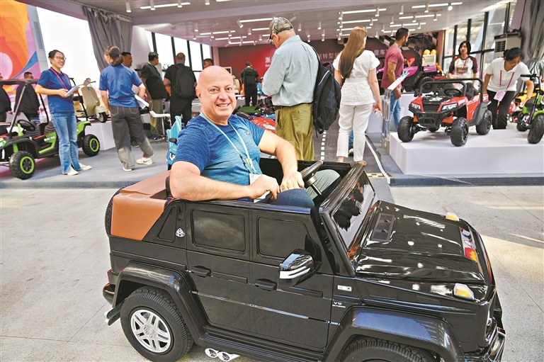 第136届广交会上,外国客商开心地体验童车。(资料图片)