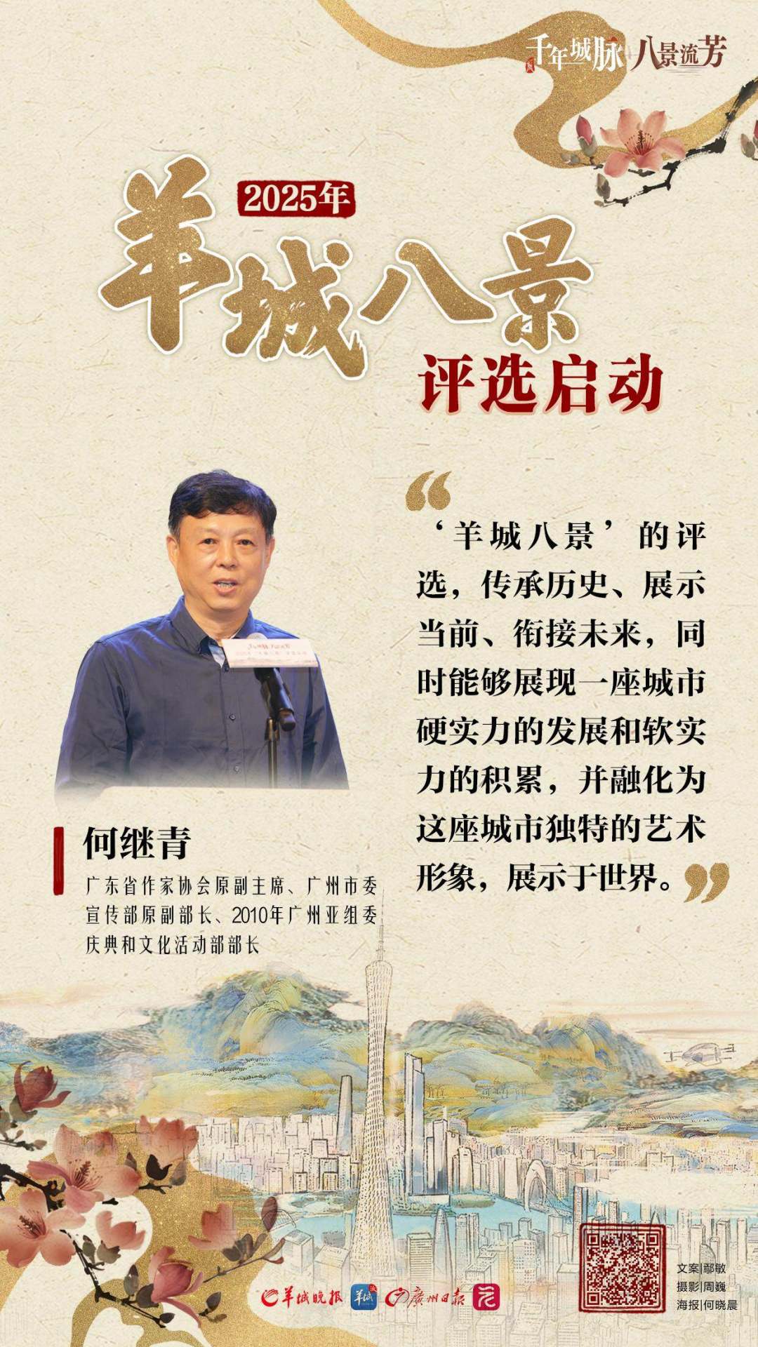 何继青表示,“羊城八景”的评选,传承历史、展示当前、衔接未来。“它还展示一座城市硬实力的发展和软实力的积累,高度有机融合为这座城市独特的艺术形象,展示于世界。”