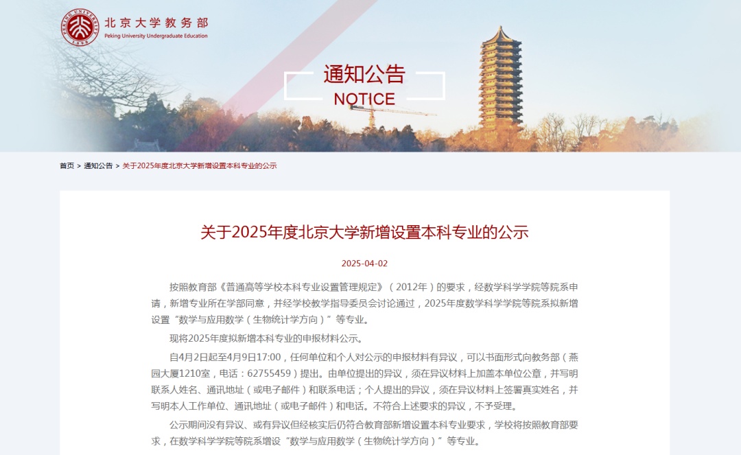 近日,北京大学教务处发布《关于2025年度北京大学新增设置本科专业的公示》。拟新增设置“数学与应用数学(生物统计学方向)”“数字治理”“工商管理专业(数字经济管理方向)”等3个专业。