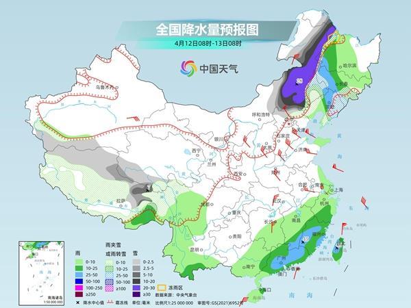 明天,内蒙古中东部、黑龙江西北部、吉林西部、辽宁西部、河北北部、青藏高原大部等地部分地区有小到中雪或雨夹雪,其中,内蒙古中东部、黑龙江西北部、吉林西部、辽宁东部、河北北部等地部分地区有大到暴雪,局地大暴雪,黑龙江西部局地有冻雨。东北地区中西部、西藏东南部、四川西部、云南西部和南部、江淮东部、江南大部、华南大部等地部分地区有小到中雨,其中,东北地区中西部、江南南部、华南东部等地部分地区有大雨。