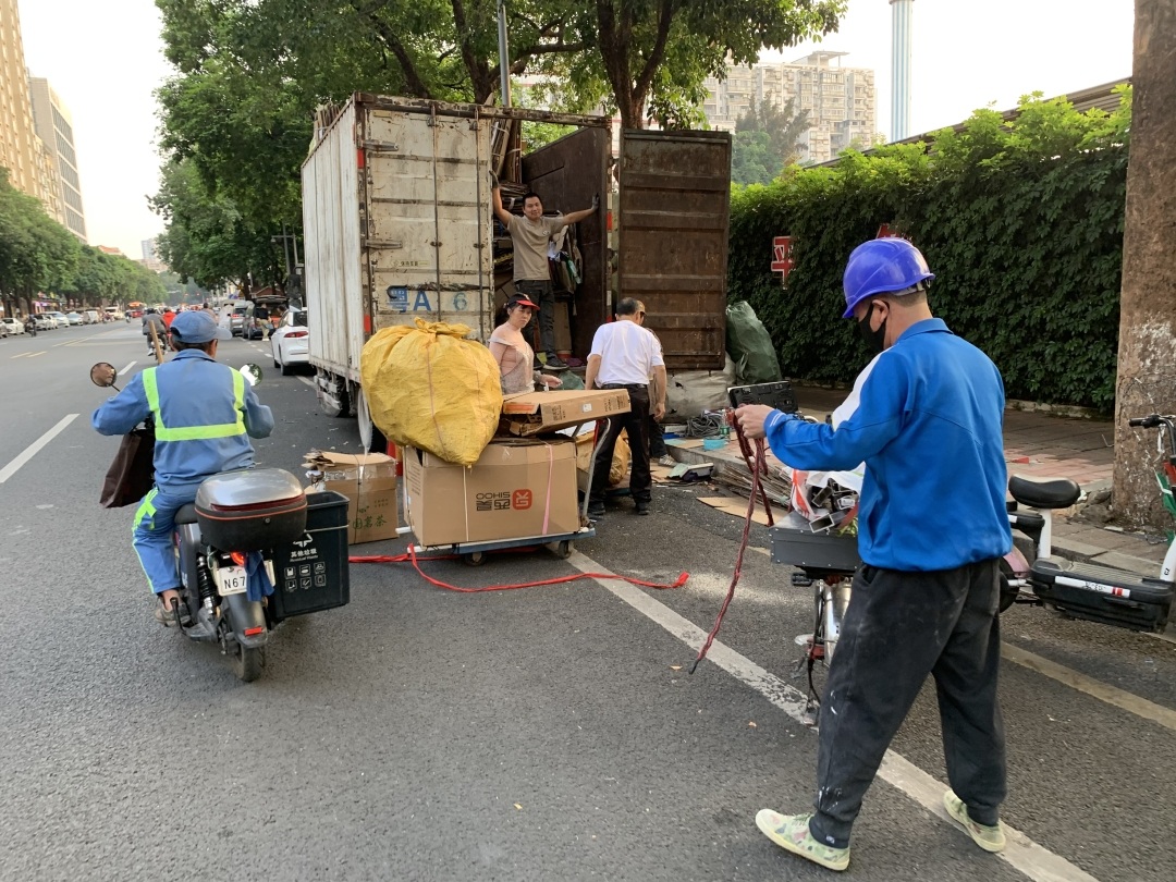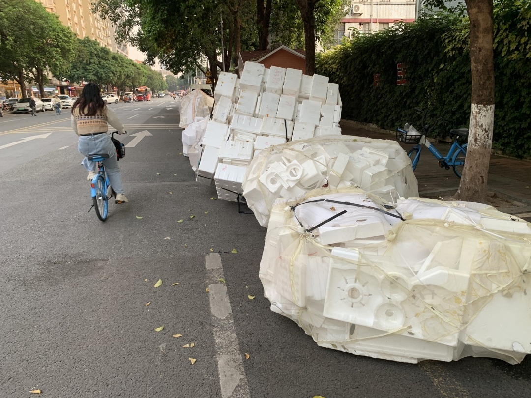 市民游客反映的问题,主要是艺博院对出的海珠区赤岗北路至赤岗路一带。在赤岗北路,人行道和非机动车道都有许多杂物堆放,阻塞道路通行。在一处环卫驿站,有许多塑胶纸箱堆放,影响市容之余,还有安全隐患。也有废品运输车违停在路边收运废品,同样给市容和交通造成影响。