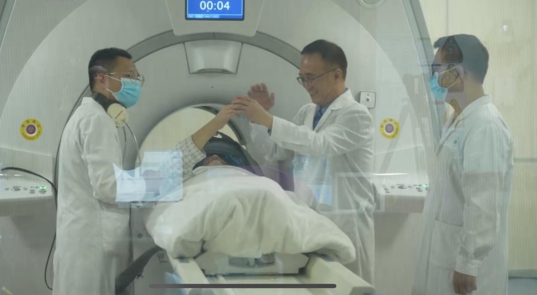 锁定靶点后,李勇杰启动指令,1024束超声光束对准脑深部的靶点发射了,与此同时,磁共振扫描持续转动,实时监测靶点脑组织的温度。大约10秒,当董阿姨感觉头部有些发热时,她右手的震颤突然停止了!那一瞬间,她几乎不敢相信自己的感觉。第二天中午,董阿姨和家人共进午餐,她拿起筷子稳稳地夹起一块菜,兴奋地向周围的人演示:“看,我的手不抖了!”这一幕,让大家忍不住欢呼起来了。