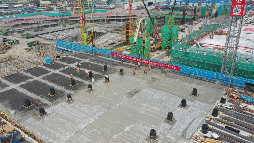 近日,随着最后一方混凝土浇筑结束,由中国铁路广州局集团有限公司站房建设指挥部建设、中铁二十五局承建的广湛高铁佛山站东西翼上盖平台主体结构顺利完成,为佛山站今年底主站房具备通车条件奠定基础。