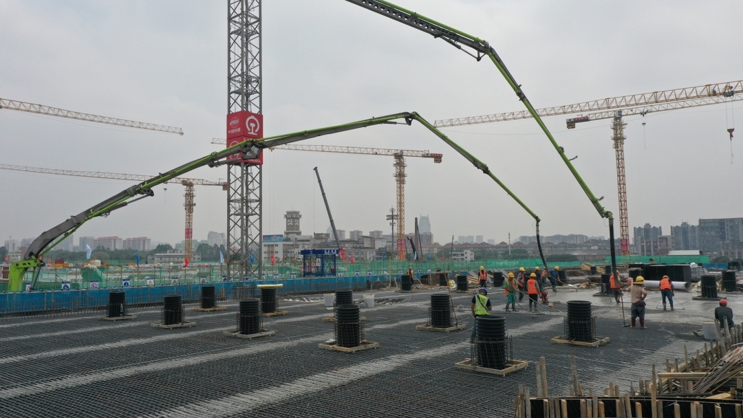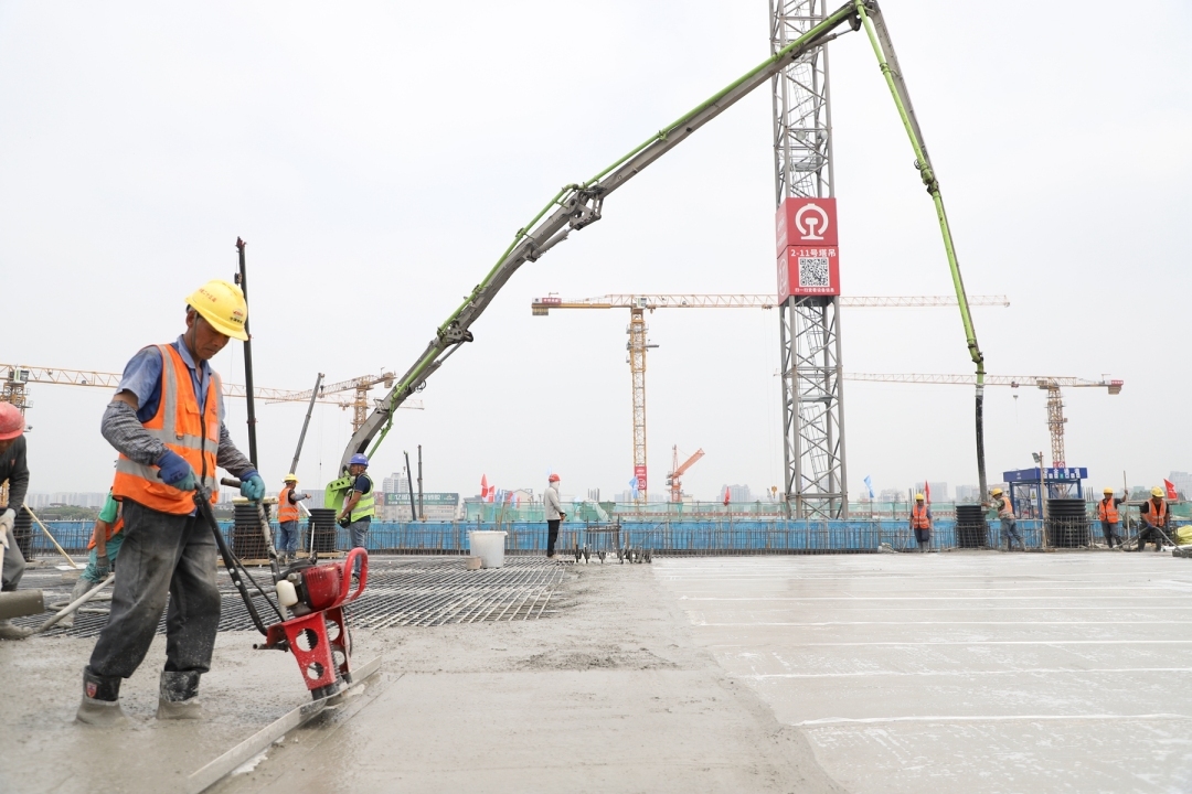 在施工现场,数台塔吊巨臂高悬,泵车长臂伸展,将混凝土精准浇筑至模板内,施工一派繁忙。此次完成浇筑的上盖平台东西长563.54米,盖板面积5.36万平方米,由324根实心混凝土框架柱支撑、传导受力,确保建筑主体结构安全。