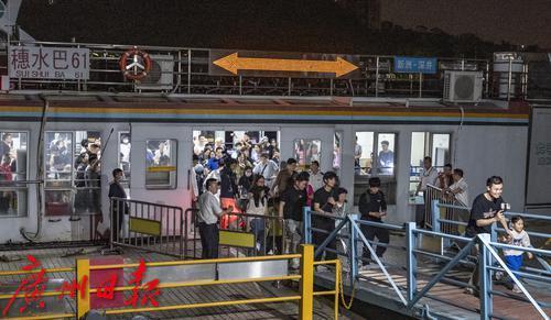 晚上9点15分,乘客纷纷登上即将从新洲开往深井的渡轮。
