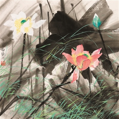 他画荷花,着力表现荷花色泽的华美,淡化笔法线条的勾勒,以色当墨,墨中带色,浓墨重彩,运用补色来突出色彩的鲜亮明快,绿梗红荷互衬生辉,加上黄蕊点缀,使荷花艳气动人,用色饱满,远看鲜艳,近看厚重,千姿百态而不媚,不局限于自然的写实,而是通过想象的夸张,体现出自己对客观自然的独特感受,把荷叶前实后虚的远近层次展现得生动立体;他画荷塘,将大面积彩墨铺染的方式,运用在荷塘水面的处理上,营造出一种如梦似仙的朦胧感,冷艳幽静。在传统笔墨情趣里凸显现代人的理念情感,使其更符合现代大众的审美趣味,具有鲜明的时代气息。