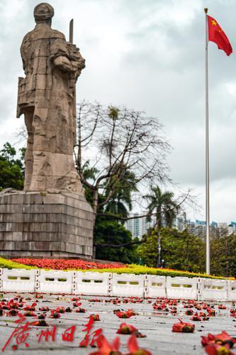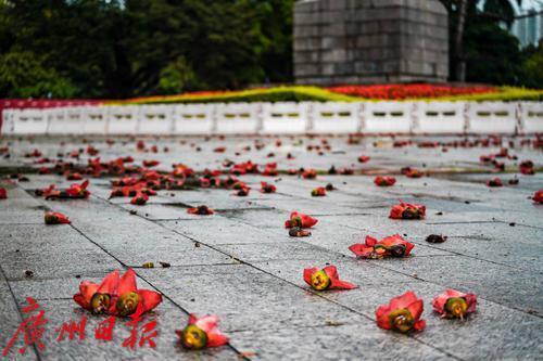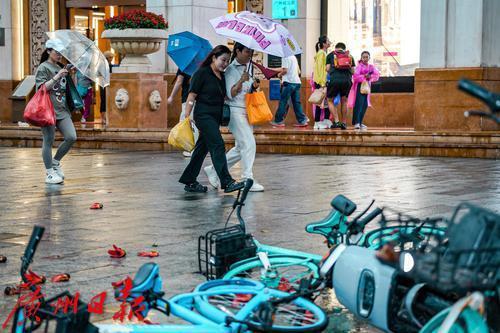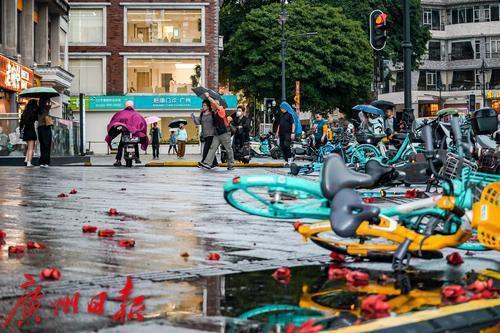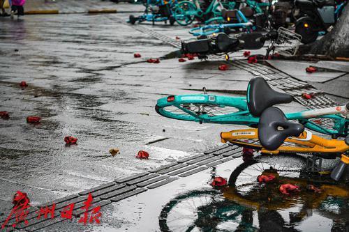 海珠广场,木棉花被风雨吹落一地,停在路边的共享单车、电单车也被大风吹倒。