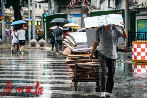 市民雨中拉车前行,拿着纸板遮挡风雨。