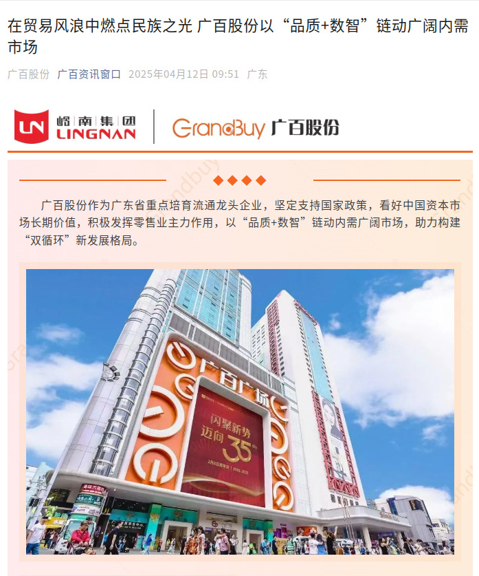 广百股份有关负责人表示,作为广东省重点培育流通龙头企业,广百股份拥有百货、超市、电器、便利店等业务板块,经营的商品中不乏相当数量的优秀本土品牌。据介绍,当前全球经济格局复杂多变,广百股份将在这场时代浪潮中与中国企业并肩前行,积极挖掘更多本土优秀企业的供应链资源,联合外贸转型企业开发自有品牌,探索开设外贸产品内销展区,利用自身平台优势与会员优势,为更多出口转内销的企业和品牌提供展示和销售机会。