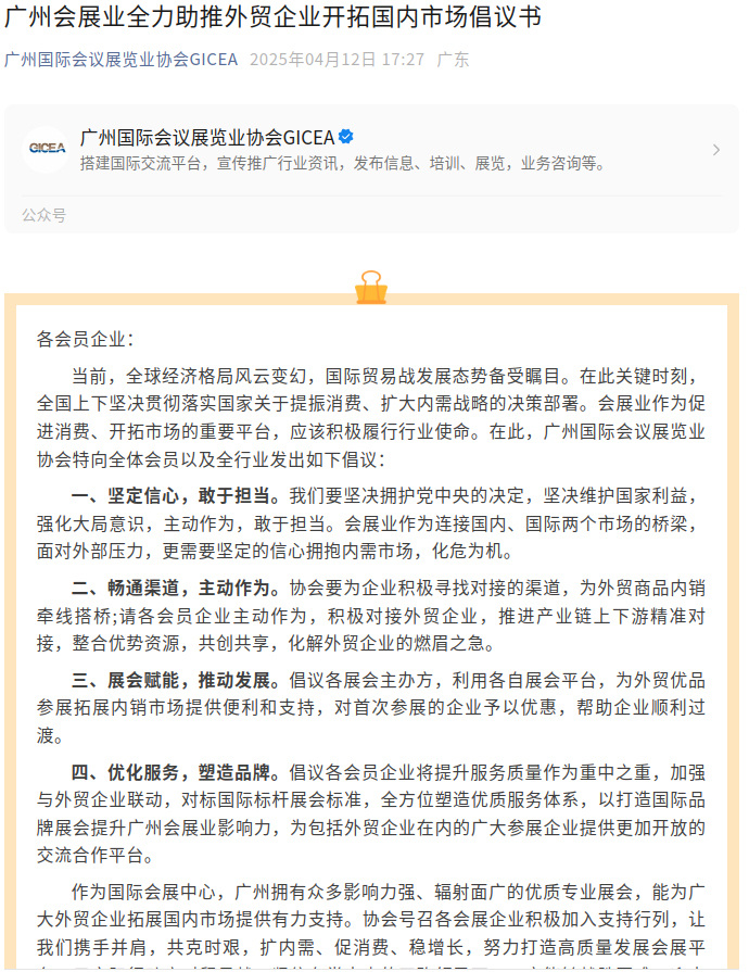 广州国际会议展览业协会4月12日发布“广州会展业全力助推外贸企业开拓国内市场倡议书”指出,协会要为企业积极寻找对接的渠道,推进产业链上下游精准对接,整合优势资源,为外贸商品内销牵线搭桥,化解外贸企业的燃眉之急;倡议各展会主办方,利用各自展会平台,为外贸优品参展拓展内销市场提供便利和支持,对首次参展的企业予以优惠,帮助企业顺利过渡。