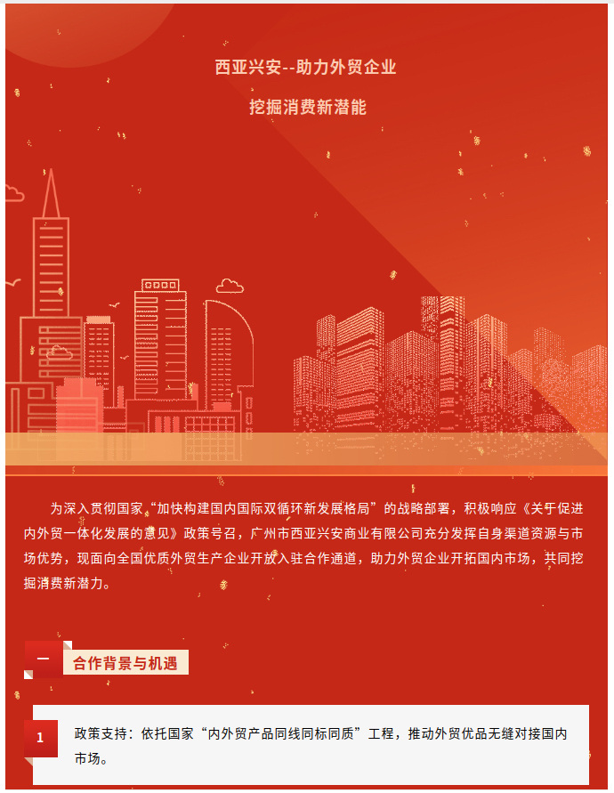 值得一提的是,4月12日,覆盖广州各区近八十家门店及线上平台的广州西亚兴安商业有限公司也发布了“助力外贸企业 挖掘消费新潜能”的官方声明,依托国家“内外贸产品同线同标同质”工程,积极推动外贸优品无缝对接国内市场,提供全渠道资源开放和平台流量支持,建立“外贸转内销”绿色通道,简化入驻流程,联合打造“外贸优品”专属营销活动。公司副总经理李琳琳说,“西亚兴安将充分发挥自身渠道资源与市场优势,面向全国优质外贸生产企业开放入驻合作通道,助力外贸企业开拓国内市场,”