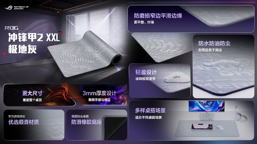 ROG冲锋甲2 XXL 极地灰鼠标垫采用全新900 x 400 x 3 mm尺寸设计,具备防水、防油、防尘功效。鼠标垫的背面材质非常出色,可以更好的稳固在桌面上。同时鼠标垫的边缘非常平滑细腻,玩家的使用体验也会非常舒适。灰白配色同时能满足更多桌搭玩家的搭配需求。