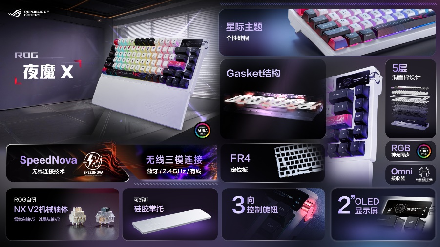 ROG夜魔X机械键盘采用了PBT热升华三面透光键帽,上面印有星际主题图案,十分炫酷。搭载全新的NX轴 V2,可以完美兼容Cherry键帽,手感一流。五层消音结构和FR4定位板,提供别具一格的新手感。ROG夜魔X还采用下灯位热插拔PCB设计,升级后的灯效流光溢彩。同时还配备了非常舒适的硅胶腕托,玩家的游戏体验也会相应升级。