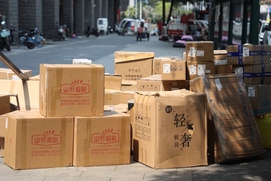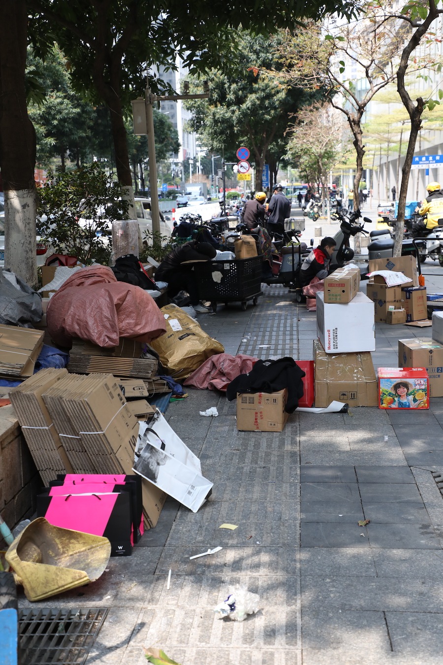 位于兴盛路的人行道旁对方的收发快件和打包纸箱,成为快递临时的“收发站”。