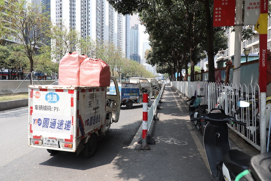 随后,记者到珠江新城片区进行了走访。在珠光御景二期门口看到,该小区位于潭村隧道西侧出口的北部,一排快递的三轮车几乎将人行道靠路边的位置停满,不少快递员拉着板车不停往返于路边与小区之间,车上的货物每次都要推放到一人多高才“出发”;同时,在潭村路多个小区的中间门口,也同样有快递员在路边进行分拣。一位快递员告诉记者,由于这里的小区比较集中,所以派发起来也会比较密集,需要一趟趟地将快件进行更仔细地分拣后才派发。