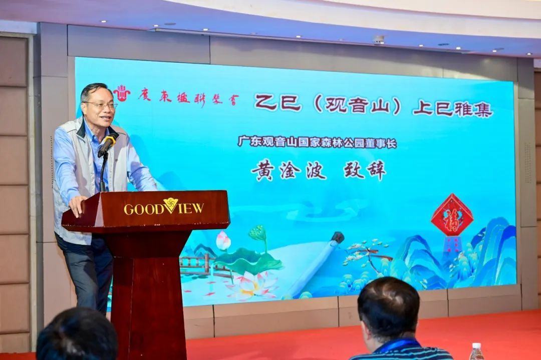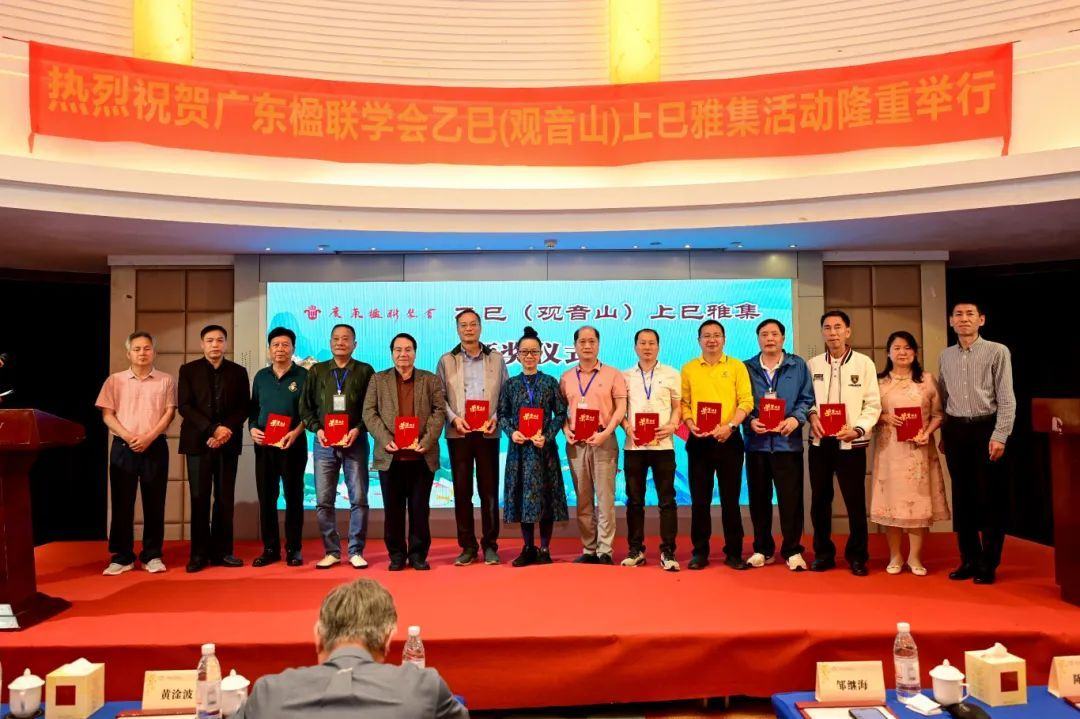 当日下午,广东楹联学会第六届会员代表大会第五次会议暨乙巳(观音山)上巳雅集在观音山召开。黄淦波董事长致欢迎辞表示:“四月芳菲时节,我们效仿古人曲水流觞、饮酒赋诗,以诗会友,以文传情。”曾建国会长总结学会2024年工作并提出2025年计划,会议对年度贡献者、优秀联教工作者、积极通讯员进行表彰,授予黄淦波、陈景玉年度贡献奖。李培隽会长肯定广东楹联学会在文化弘扬方面的成果,特别提到“观音山上观山水”征联活动在全国的反响。邹继海主任提出“五个通报”包括推动三省两区楹联文化联盟、诗钟擂台大赛、持续开展征联活动等,并建议传统文化组织抱团发展。陈景玉主任代表观音山交接“上巳雅集”会旗。
