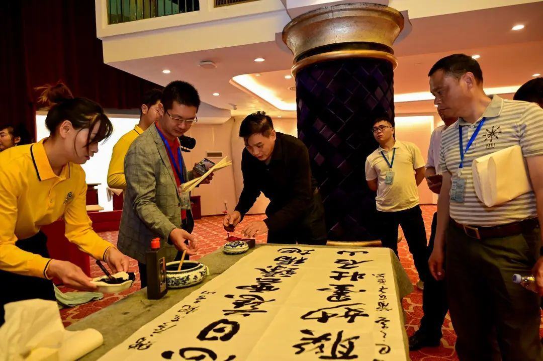 在书画创作交流活动前,邹继海先生为观音山赠送墨宝“上巳风流源上古,名家荟萃咏名山”,并介绍“上巳雅集”历史渊源,肯定观音山作为首家中国楹联名山的地位。他呼吁在场楹联家“承兰亭雅韵、聚群贤胜事,以生花妙笔让观音山人文胜境之美名远播四海”。曾建国先生同时为观音山赠送画作。随着歌舞表演,书画创作交流活动正式启动,楹联家们将情感融入书画创作,现场翰墨飘香,文化氛围浓郁。不少楹联家书桌前聚集书法爱好者互动交流。李培隽会长现场书写“中国楹联文化名山”赠予观音山,众多楹联家即兴挥毫创作墨宝。