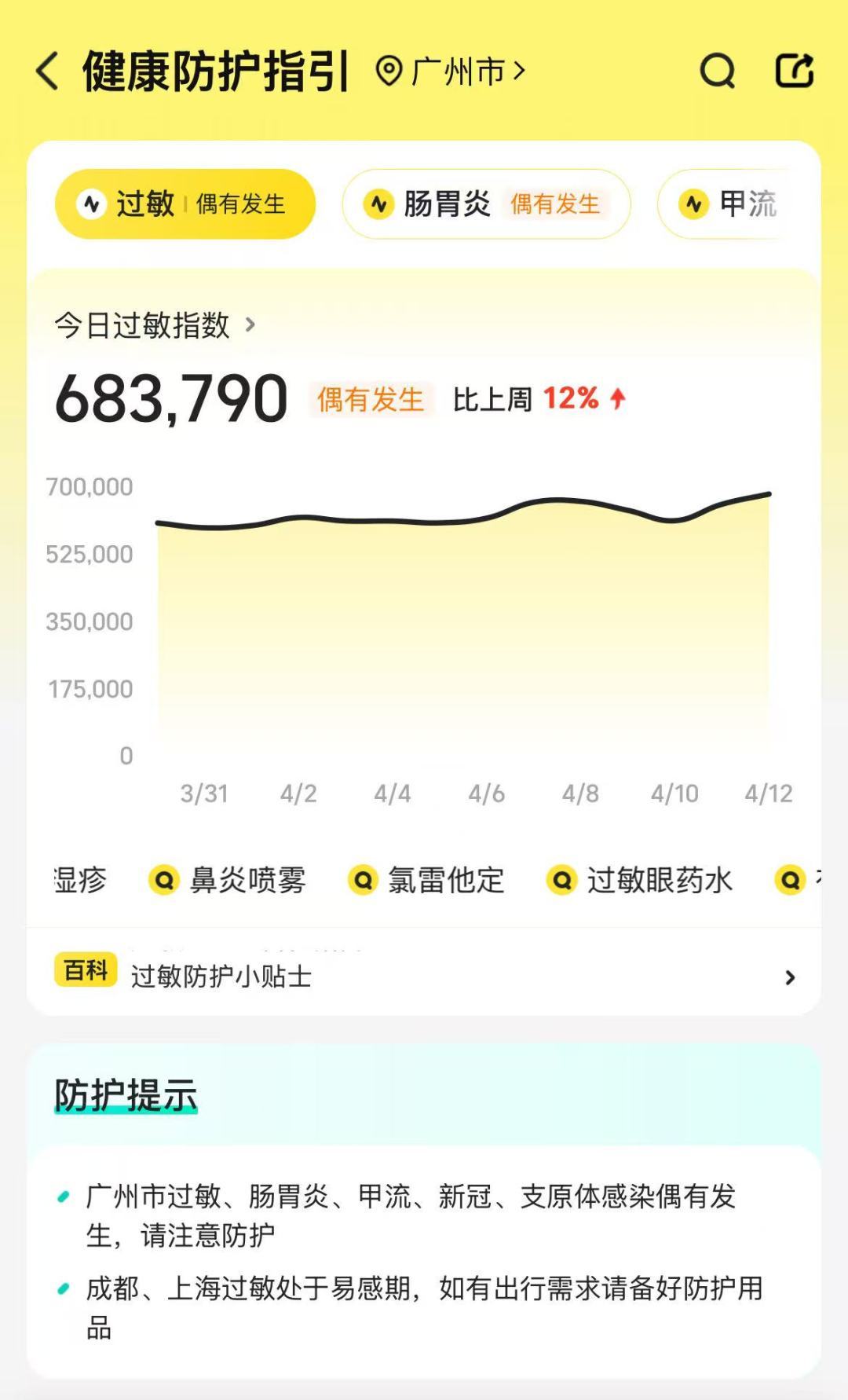 在美团买药平台,广州市今日健康防护指引显示:过敏指数比上周增加12%,当前广州市过敏、肠胃炎、甲流、支原体感染等都有发生,需要加强防护。