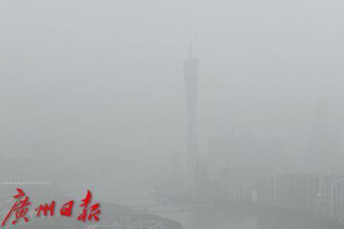 笼罩在沙尘中的广州塔变得朦胧不清。