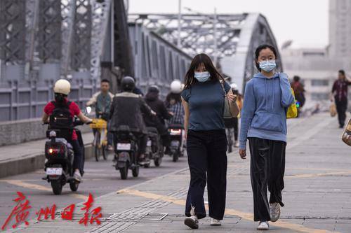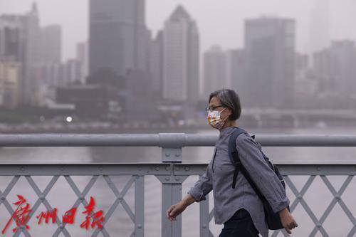 市民经过海珠桥,远处的江景在沙尘的影响下变得朦胧。