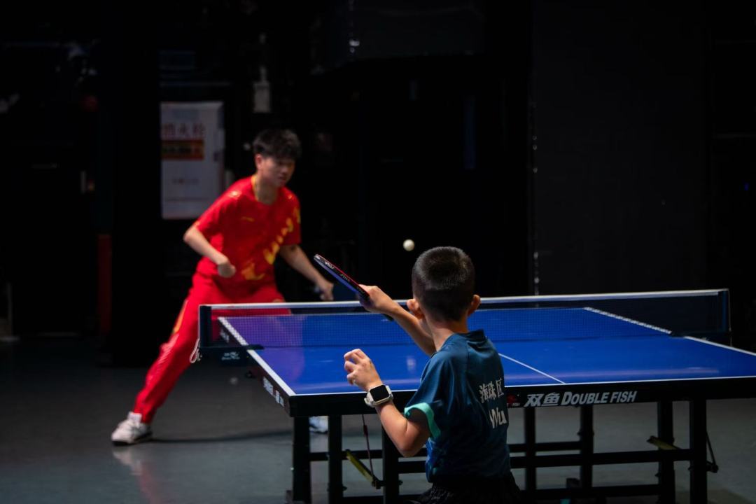 活动中,两位运动员与学生们进行了多维度互动。在乒乓球技艺展示环节,他们与少年宫乒乓球教练、学员上演精彩对攻,双打、一对一、花式表演,高超的球技令观众赞叹不已;更有孩子体验“冠军陪练”,刘朝栋手把手地指导孩子与彭伟楠交手,活动现场充满了乒乓球的清脆撞击声和观众的欢呼喝彩声。活动还通过视频回顾了两位运动员赛场上的高光时刻,让孩子们直观体会“永不言弃”的体育精神。