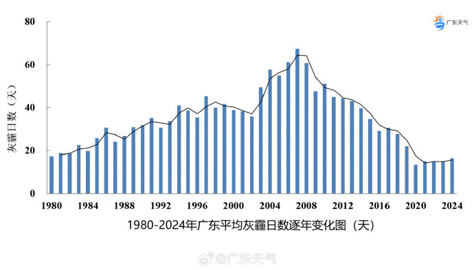 近年来,我省大气污染防治成效显著, PM2.5年均浓度已连续5年保持在25 μg/m³以下,达到国家二级标准;灰霾日数连续5年维持在20天以下,显著低于1980以来的最高值67.3天(2007年)。