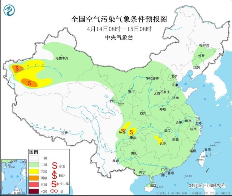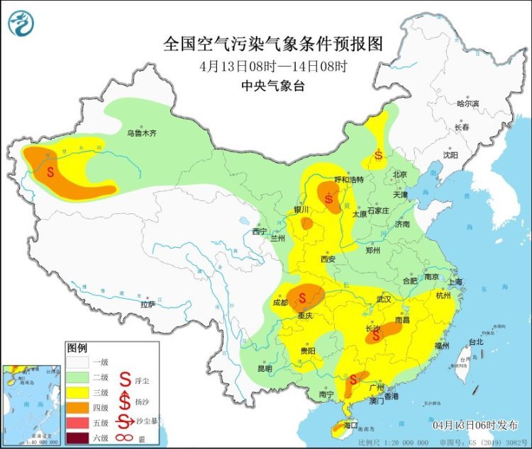 受地面大风和沙尘传输影响,预计4月13日08时至14日08时,新疆南部、内蒙古中西部、甘肃东部、宁夏大部、陕西北部和南部、山西西部、河北西北部、四川盆地、重庆、贵州中部、湖北中部、湖南大部、江西中南部、浙江西部、福建西北部、广东北部和西南部、广西东部、海南北部和西部等地的部分地区有扬沙或浮尘天气。中央气象台4月13日06时继续发布沙尘暴蓝色预警。