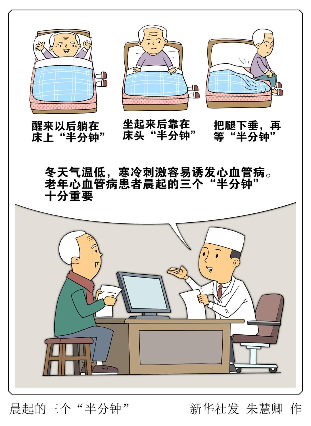 清晨6至10点,人体交感神经活跃,血管随之收缩,血压迅速升高,老年人若突然从卧位起身时,血液因重力迅速下移,易导致脑部供血不足。因此老年心血管病患者晨起的三个“半分钟”十分重要:即醒来以后躺在床上“半分钟”,伸伸懒腰,不要立刻起床下地;坐起来后靠在床头“半分钟”,这个半坐的体位可以使心脏和血管的负担开始逐渐增加;把腿下垂,再等“半分钟”,这是再一次预热,使心血管系统适应直立状态。