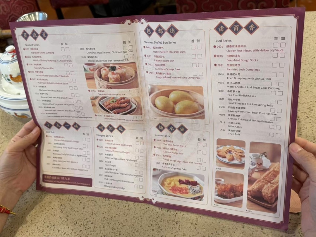 Steamed Red Rice Rolls with Shrimp(金莎红米肠)、Signature Shrimp Dumplings(招牌虾饺皇)……在点都德一家门店内,服务员给记者递上了一张中英文“点心纸”。