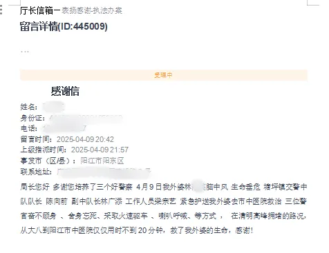 “……我外婆脑中风,生命垂危,当时路况拥堵,是阳东区塘坪镇交警中队队长陈向前、副中队长林广添、工作人员梁宗艺驱车紧急护救,才救了我外婆的生命!很感激!”这是阳东公安“平安厅”信箱近日收到的来自阳东邓先生的感谢信中的大致内容。