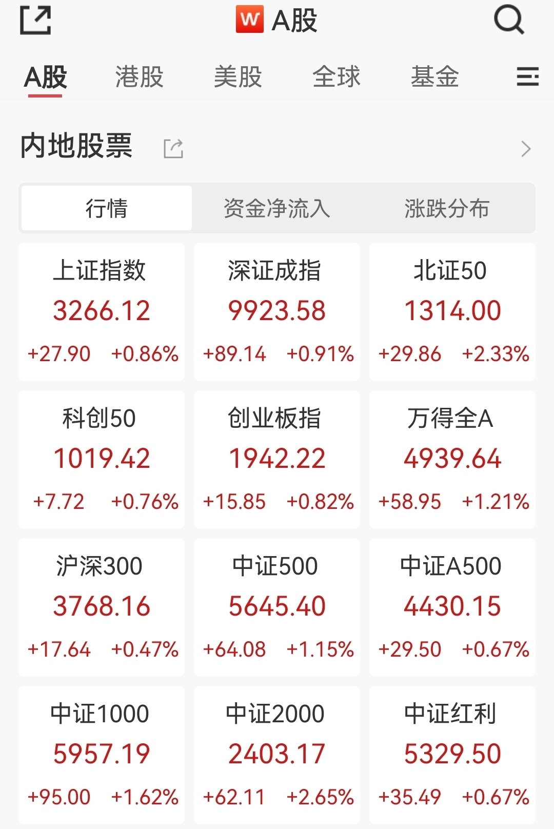 4月14日,A股市场逾4800股上涨,三大指数集体上涨。截至收盘,上证指数午盘涨0.86%报3266.12点,深证成指涨0.91%,创业板指涨0.82%,A股半日成交8621.15亿元。