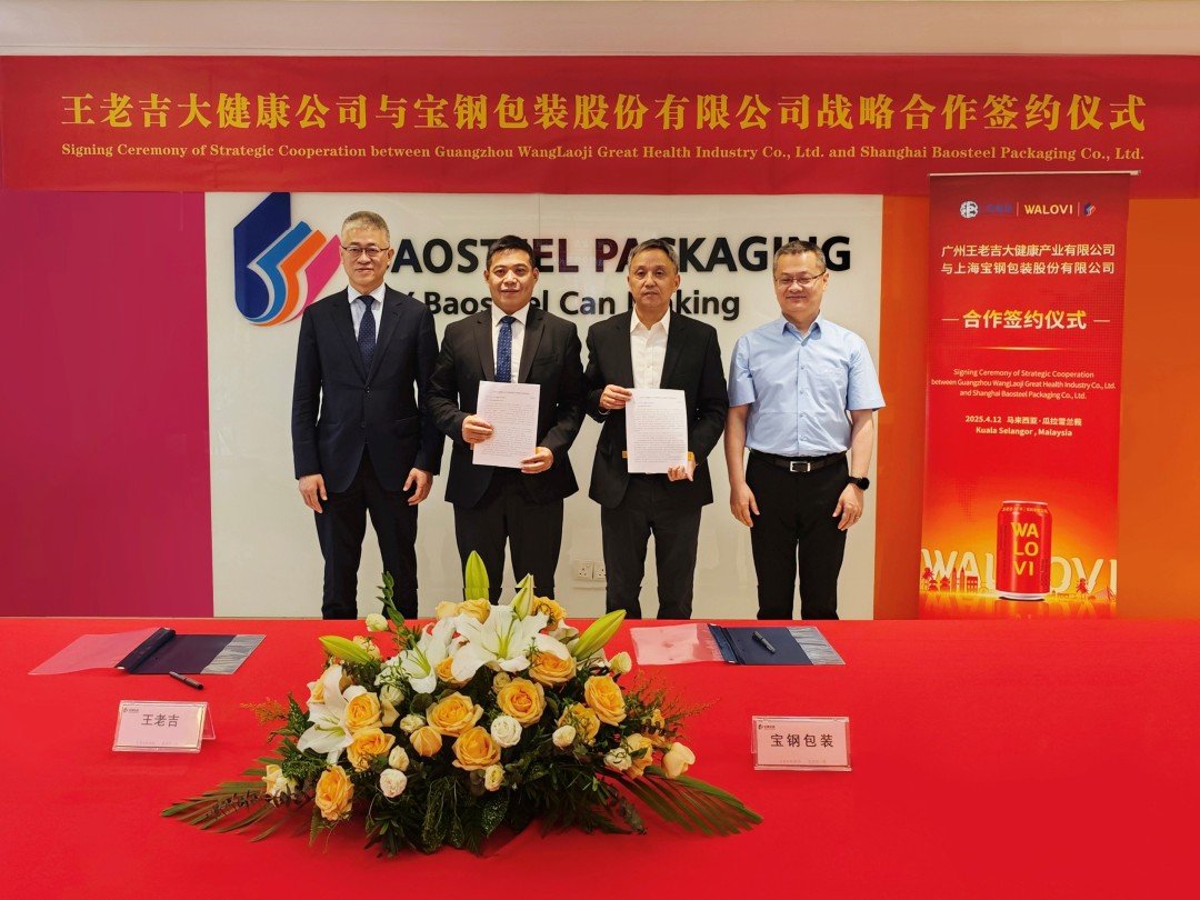 4月12日,广药集团总经理杨军、王老吉大健康公司总经理方达锋等到访宝钢包装马来西亚制罐工厂,与宝钢包装党委书记朱未来、高级副总裁葛志荣、副总裁方春华、马来西亚宝钢总经理黄文卿就双方加强在海外供应链合作上进行了深入交流,王老吉与宝钢包装双方签署了全球化战略合作协议,未来双方将围绕海外供应链协同、海外市场开拓、新包装材料产品研发等三方面进行深入合作。